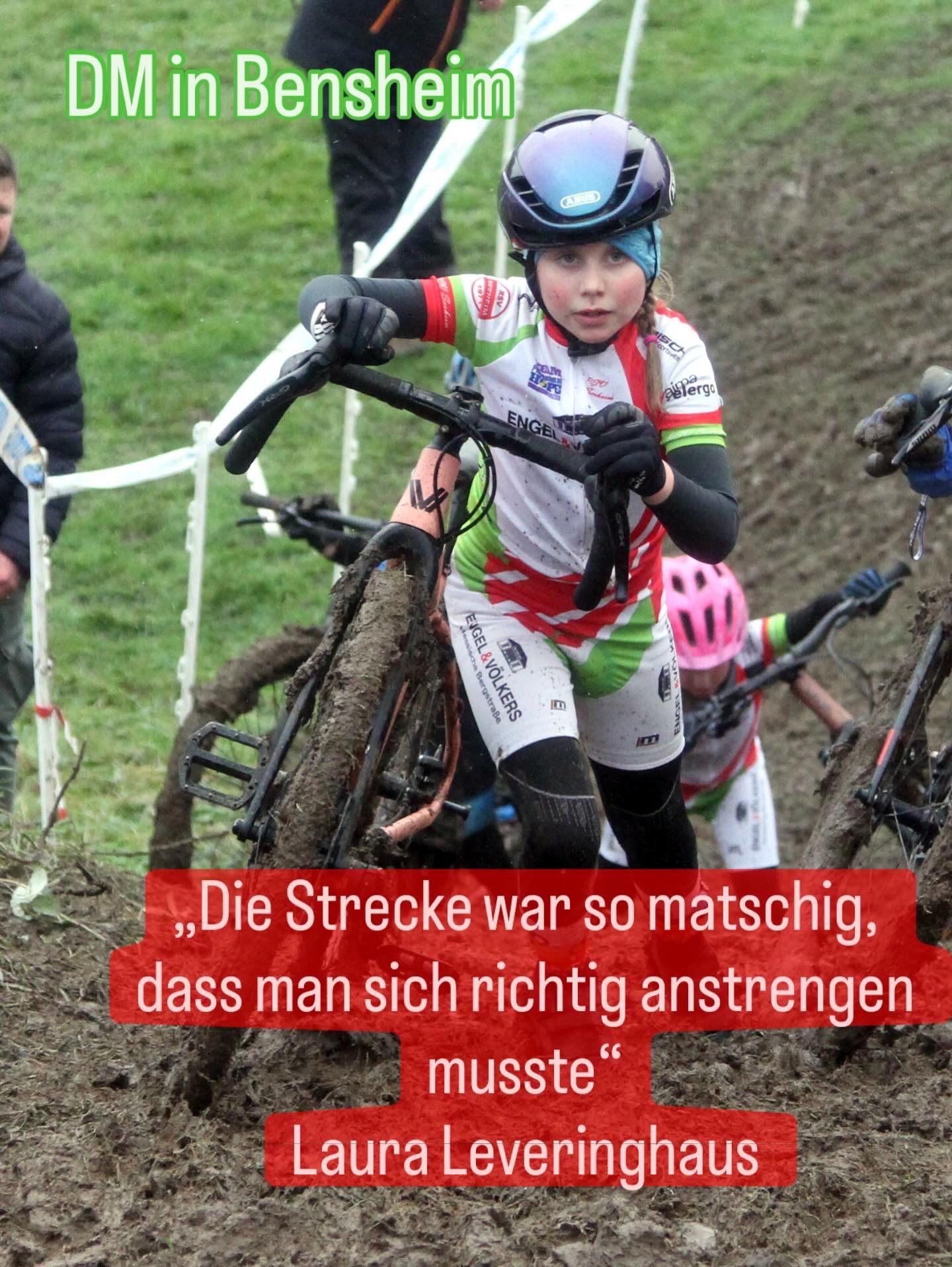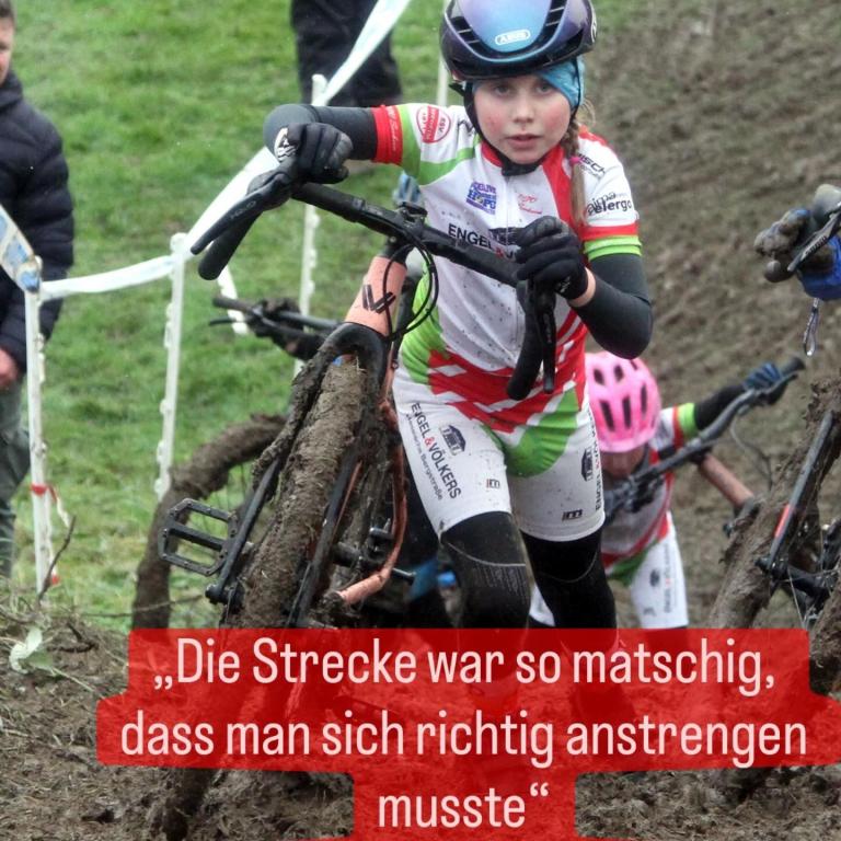 Das sonst vor Cyclocross-Rennen stattfindende Laufen gab es in Bensheim nicht. Aber die Strecke sorgte dafür, dass man auf großen Teilen der Strecke das Fahrrad nur schieben konnte. Bei Laura blockierte aufgrund des Schlamms sogar komplett das Hinterrad – erst kurz vor dem Ziel konnte sie wieder fahren. Dafür sprang bei dieser Energieleistung auch der erste Platz heraus.
